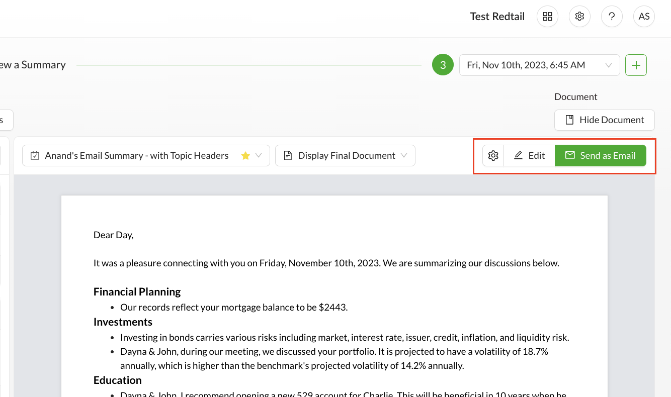 After you sent an email out to your client, next to the "Edit" button will appear a clock icon - "Past Communications." By clicking on it you can see all documents sent, printed or saved from this meeting.